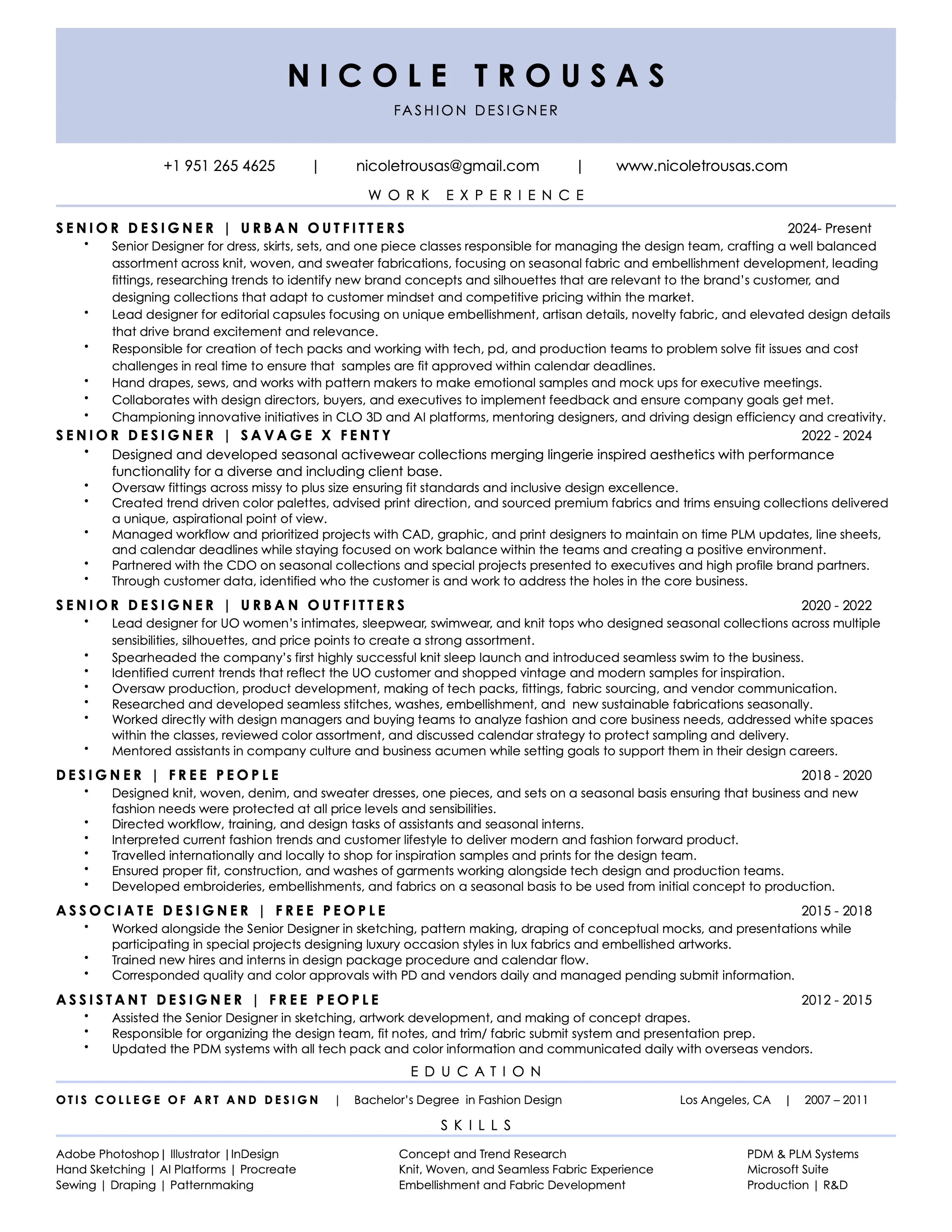 Nicole Trousas is a visionary fashion designer driven by a passion for storytelling through silhouette, fabric, and embellishment, creating collections that balance emotional resonance with refined craftsmanship. Inspired by art, culture, and human connection, I approach each design as an opportunity to craft pieces that feel intimate, luxurious, and transformative. With a meticulous eye for detail and a dedication to innovation, I develop thoughtful, elevated collections that merge modern sensibilities with timeless sophistication. I thrive in creative, collaborative environments where bold ideas meet precision execution, always seeking to deliver meaningful, lasting impressions through design that speaks to both the heart and the market.